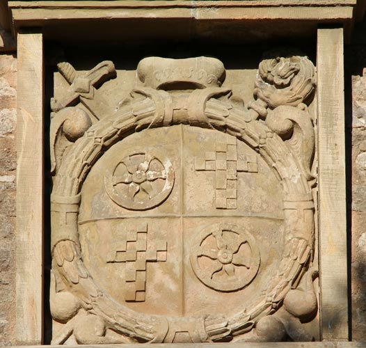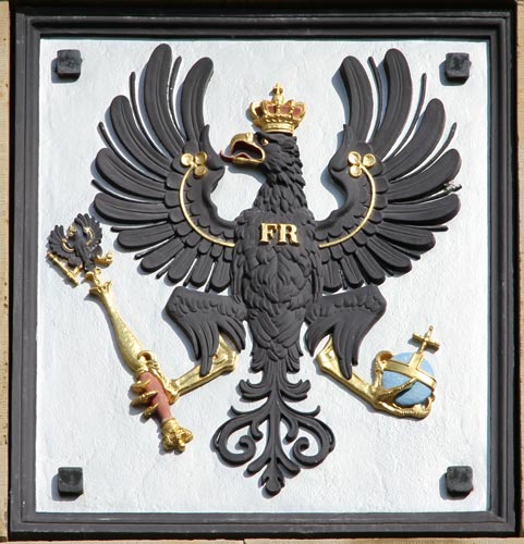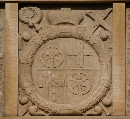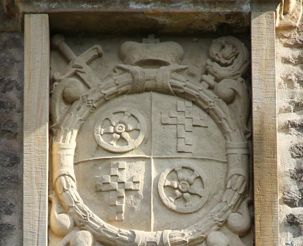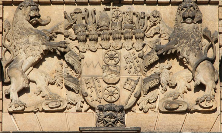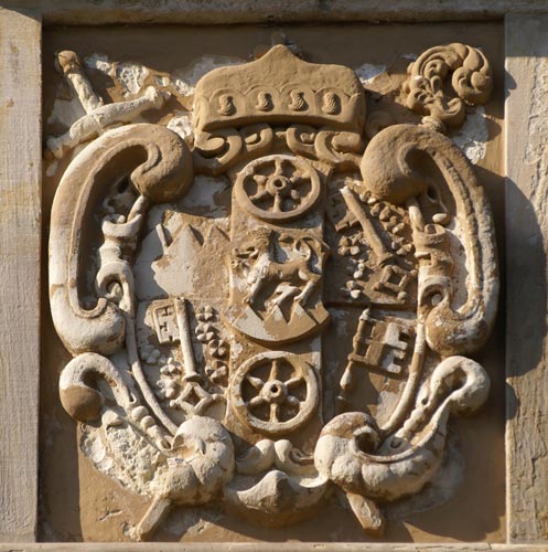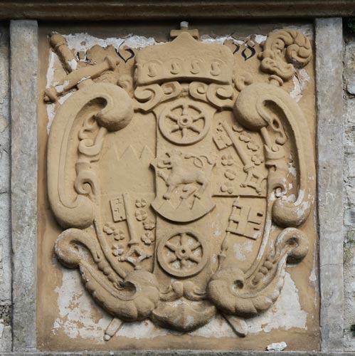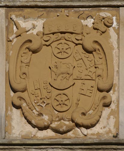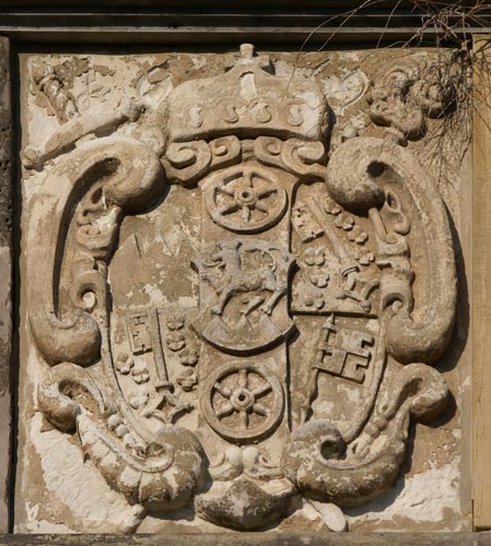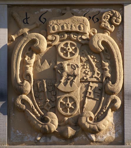 Dazu werden sechs Helme geführt. Es ist eine große Seltenheit, das Wappen dieses Kurfürsten mit vollständigem Oberwappen in der Bauplastik zu finden, weil es meist nur mit Kurhut geführt wird.