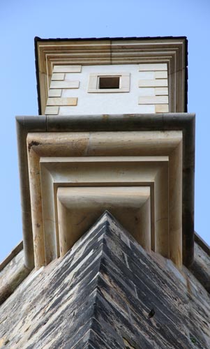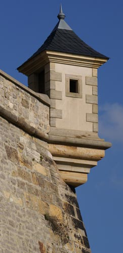 Abb. links: Das Wappen an der Südostflanke der Bastion Kilian ist auf 1669 datiert und zeigt das Wappen des Mainzer Kurfürsten Johann Philipp von Schönborn wie beschrieben. Abb. rechts: Blick von unten auf den Wacherker an der Bastionsspitze.