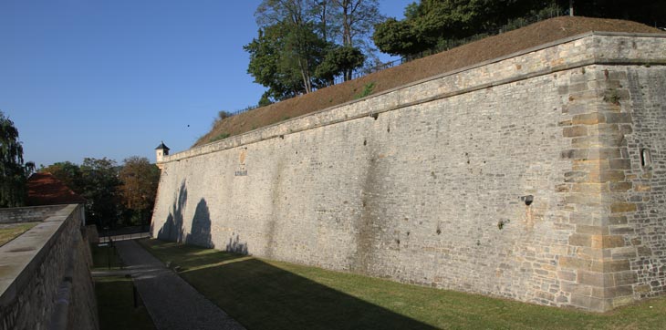 Die Bastion Kilian ist von besonderer Wichtigkeit, weil sie zusammen mit der Bastion Leonhard den Hauptzugang in die Zitadelle schützt. Im Bild oben die Südostflanke der Bastion Kilian mit Blick in den Zwischenraum zum Ravelin Peter (1708, abgerissen und rekonstruiert; unten ist ein Raum als Weinkeller eingerichtet). Die Bastion Kilian wurde 1668-1669 von italienischen Bautrupps errichtet. 1995-1998 wurde sie saniert. Sie wird heute für Veranstaltungen genutzt.