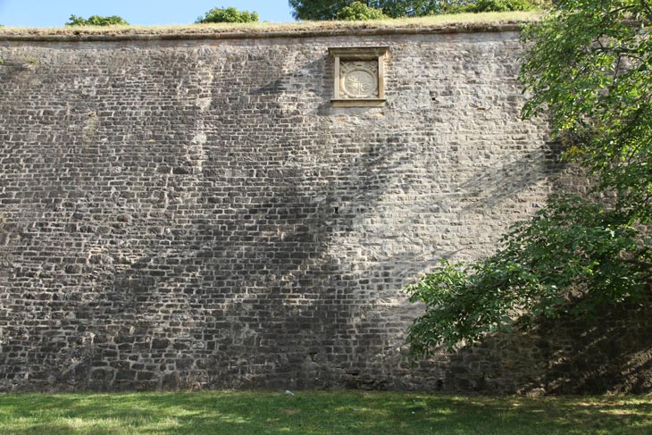 Das Wappen rechts an der Südostflanke der Bastion Martin ist auf 1668 datiert und zeigt das Wappen des Mainzer Kurfürsten Johann Philipp von Schönborn wie beschrieben.