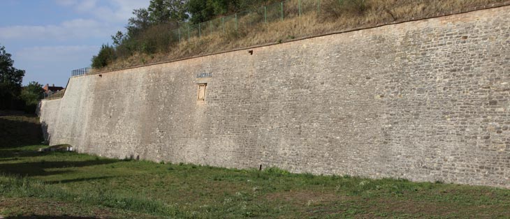 Die Bastion Kilian liegt stadtseitig im Südosten der Zitadelle zwischen der Bastion Martin und der Bastion Leonhard. In den Winkel zwischen den beiden letztgenannten ist noch das freistehende Ravelin Peter vorgeschoben. Im Bild oben die südwestliche Flanke der Bastion Kilian, dahinter angeschnitten das Ravelin Peter. Unten am Mauerfuß befindet sich ein 1943-1944 angelegter Schutzeingang mit zwei Treppen und einer Betonüberdachung. Hier kam man zu den Minengängen, die als Luftschutzräume der Erfurter Zivilbevölkerung bei britischen und amerikanischen Luftangriffen genutzt wurden.