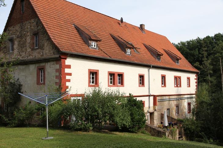 An der nordöstlichen Längsseite des Gebäudes ist eine hochrechteckige Wappentafel angebracht. Auf dem geschweiften und an den Enden gezipfelten Schriftband kann man nichts mehr erkennen. Das Wappen jedoch ist eindeutig als dasjenige des Fuldaer Fürstabtes Johann Friedrich von Schwalbach (regierte 1606-1622) zu identifizieren. Es ist geviert, Feld 1 und 4: in Silber ein schwarzes, durchgehendes Kreuz, Hochstift Fulda, Feld 2 und 3: in Rot schrägrechtsbalkenweise drei silberne Ringe, Stammwappen der von Schwalbach.