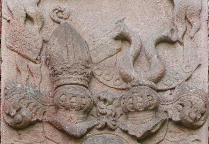Das selten in bauplastischer Form zu findende Wappen dieses Fürstabtes wird mit zwei Helmen geführt, Helm 1 (rechts): auf dem gekrönten Helm mit schwarz-silbernen Decken eine Bischofsmütze, aus der noch zwei Fähnchen schräg nach außen herausragen, die jeweils gespalten sind, innen in Rot eine grüne Lilienstaude mit drei silbernen Blüten, außen in Gold ein schwarzer Adler am Spalt, durch die Inful ist senkrecht ein Bischofsstab gesteckt, Fürstabtei Fulda, Helm 2 (links): auf dem rot-silbern bewulsteten Helm mit rot-silbernen Decken zwei oben silberne, unten schwarze Büffelhörner zwischen zwei roten, mit je drei silbernen Ringen belegten Ohren. Die typischen Insignien wie Fürstenhut, Schwert und separater Krummstab fehlen.