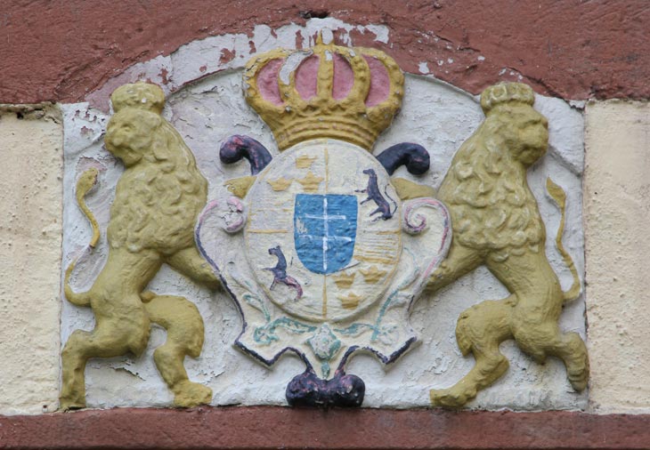 Auf dem Schild ruht die schwedische Königskrone, als Schildhalter dienen zwei goldene, widersehende, gekrönte Löwen. Das Wappen wird beschrieben im Siebmacher Band: SouvAd Seite: 41 Tafel: 98 und im Siebmacher Souv1 Seite: 32 Tafel: 60. Der Maler wußte es nicht besser und hat komplexe historische Querverbindungen durch seine Übermalung verwischt. Es lohnt sich aber, die Feinstruktur im Stein genau zu betrachten: Wenn man nun weiß, was man sehen muß, ist trotz Verwitterung noch erstaunlich vieles an Strukturen vorhanden. Es wäre wünschenswert, daß das bei einer dringend nötigen Restaurierung wiederhergestellt würde, denn so ergibt die Bemalung keinen Sinn.