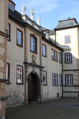 Im Norden springen an den Ecken turmartige Erkerbauten nach außen vor, umgebaute Türme der alten Wasserburg; in der Mitte der aus dem 17. Jh. stammenden Fassade liegt der alte Schloßeingang. Nur das Portal der Nordseite wurde 1738 erneuert. Ehemals war hier ein Wirtschaftshof vorgelagert, von dem sich nur wenige Bauten erhalten haben.