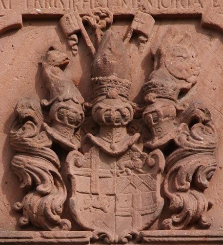 Das Wappen des Fürstabtes Johann Bernhard Schenk zu Schweinsberg (lebte 1584-16.11.1632, regierte 1623-1632) ist geviert, Feld 1 und 4: in Silber ein schwarzes, durchgehendes Kreuz, Hochstift Fulda, Feld 2 und 3: geteilt, oben in Blau ein goldener, (hier linkshin) schreitender Löwe, unten in Silber vier (3:1) rote Rauten, Stammwappen der Schenk von Schweinsberg. Die ungewöhnliche Wendung der Löwen kann ihre Ursache darin haben, daß sie zum Allerheiligsten der Kirche, in Richtung Altar blicken sollen.