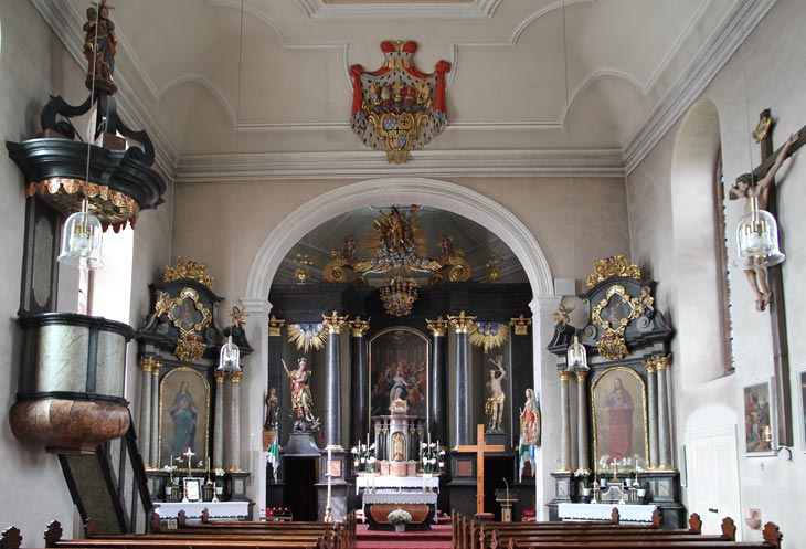Auch das Innere der Pfarrkirche St. Georg (Abb. oben) ist eine bauplastische Verherrlichung des fürstäbtlichen Bauherrn: Insgesamt sehen wir am gesamten Bauwerk fünfmal sein Wappen. Außer an der bereits beschriebenen Stelle über dem Eingangsportal ist es über dem Chorscheitelbogen zu finden, am Hochaltar und an beiden schräg in die Ecken gestellten Seitenaltären. Dabei findet eine Abstufung der Darstellung hinsichtlich der dargestellten Elemente statt: Die vollständigste Form mit allen fünf Helmen und Wappenmantel kommt zweimal vor, über der Eingangstür und über dem Chorscheitelbogen. Das Wappen am Hochaltar läßt den Wappenmantel weg, zeigt aber noch alle fünf Helme. Die beiden Wappen an den Seitenaltären sind hingegen eine reduzierte Form ohne Helme, nur mit Fürstenhut. Somit ergibt sich eine Steigerung von der Seite zur Mitte, und in der Mitte noch einmal eine Steigerung von unten nach oben in der Blickrichtung des Besuchers.