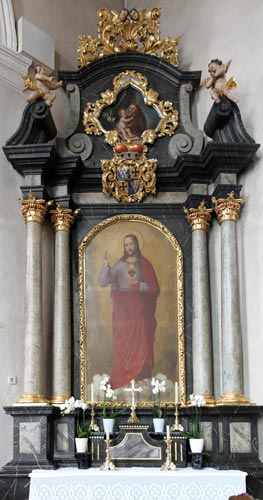 Beide Abb. oben: linker (südlicher) Seitenaltar; beide Abb. unten: rechter (nördlicher) Seitenaltar. Die beiden gleich konzipierten und sich nur in den jeweils zwei Gemälden und in der exakten Haltung der beiden Putten auf den seitlichen Teilen des Sprenggiebels unterscheidenden, jeweils schräg ins Eck des Langhauses gestellten Seitenaltäre tragen in der Mitte des doppelt verkröpften Gebälks aus schwarzem und grauem Stuckmarmor je ein Wappen des Bauherrn. Die Inhalte des Schildes sind die oben beschriebenen. In beiden Fällen ist der Hintergrund des Herzschildes unzutreffenderweise nicht silbern, sondern golden. Auf ein Oberwappen mit Kleinoden wird verzichtet; auf den Schild wird hier direkt der hermelingestulpte Fürstenhut mit goldenen Bügeln und rotem Futter gesetzt. Auch die Amtsinsignien für die geistliche und die weltliche Macht sucht man vergeblich. Dafür beeindrucken diese Seitenaltarwappen durch den aufwendig geschnitzten und mehrfach durchbrochenen, äußerst dynamisch gestalteten ornamentalen Rahmen. Seitlich setzt direkt die aus vergoldeter Schnitzerei geschaffene Umrahmung des oberen Gemäldes an, so daß das Wappen kompositorisch mit dieser verschmilzt.