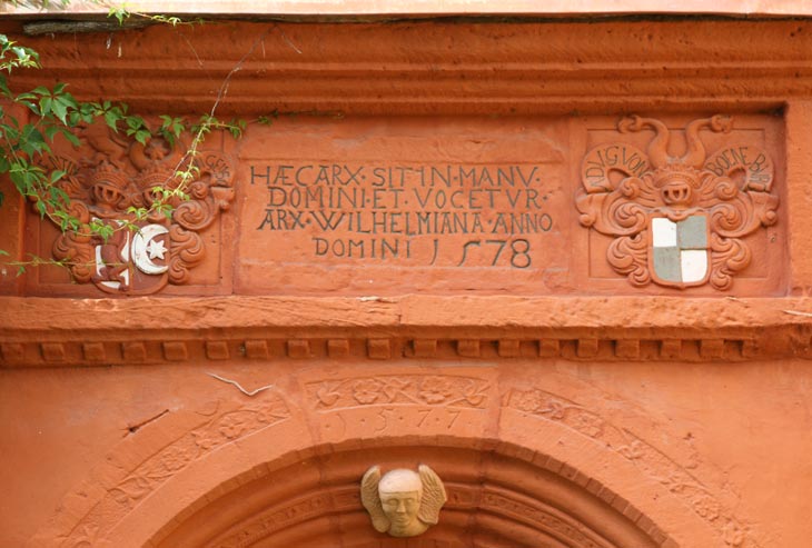 Das Portalgewände trägt über dem kleinen Engelskopf im Scheitel die Jahreszahl 1577; der darüber befindliche Wappenstein ist hingegen auf das darauffolgende Jahr datiert. Die Inschrift zwischen den beiden Teilen des ehelichen Wappenpaares lautet: "HAEC ARX SIT IN MANV DOMINE ET VOCETVR ARX WILHELMIANA ANNO DOMINI 1578" - Diese Burg sei in Gottes Hand und werde Wilhelmsburg genannt 1578. Die Zuordnung der beiden erhabenen Wappen, die qualitativ und stilistisch nicht zum Jahr 1578 passen, später vermutlich durch Aufstuckierung ergänzt wurden und aus dem 17. Jh. stammen, erfolgt auf den hinter den Wappen angebrachten Schriftbändern: "VALENTIN VON GEYSO" und "ADVG VON BOENEBVRG". Der Name Wilhelmsburg bezieht sich auf den Bauherr des Jahres 1578, Wilhelm von Mansbach. Die Herren von Mansbach werden bereits im 13. Jh. genannt. Abt Bertho IV. von Fulda zerstörte 1276 ihre Vorgängerburg. Zunächst war Mansbach ihr Eigengut, dann trugen sie es in der Mitte des 15. Jh. dem Fürstabt von Fulda zu Lehen auf, von dem sie es 1446 als Erblehen erhielten. Aufgrund finanzieller Engpässe wurde ein Teil des Besitzes 1454 an das Stift Fulda versetzt. Die Herren von Mansbach teilten sich in drei Linien, wovon die Linie von Wilhelm von Mansbach ihren Anteil 1652 an die von Geyso verkauft hatte, die seitdem in Mansbach ansässig waren. Eine weitere Linie war die von Karl von Mansbach, die den Oberhof besaß (siehe dort).