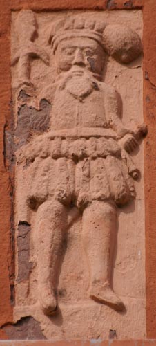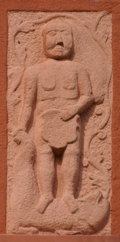 Neben dem achteckigen Treppenturm ist die rechteckige Auslucht, die zwar gleichzeitig mit dem Herrenhaus entstand, aber dennoch technisch ein selbständig tragendes Gebäude darstellt, ein besonderes Schmuckstück der Südseite, weil die Brüstungsfelder Reliefs tragen. In den Brüstungsfeldern des Hocherdgeschosses (hangseitig das Geschoß über dem Sockel) sind die rechteckigen Felder allseitig mit großen Blüten verziert. Im ersten Obergeschoß sind die Felder mit Reliefbüsten geschmückt, wobei an der Schauseite die seitlichen Büsten einwärts gedreht und der mittleren zugewandt sind. Dazu werden die Fenster seitlich von flachen Figuren-Reliefs begleitet, die links einen Söldner und rechts eine nackte Frau zeigen, wobei letztere sich einen inhaltsleeren Schild vor die Scham hält.