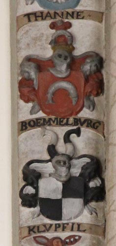 Das vierte Wappen von oben ist das der von Boineburg ("BOEMMELBVRG"), silbern-schwarz geviert, auf dem Helm mit schwarz-silbernen Decken ein silbern-schwarz übereck geteiltes Paar Büffelhörner. Darunter folgt als nächstes das Wappen der von Elkershausen gen. Klüppel ("KLVPFIL"), in Rot drei (2:1) aufrechte silberne Beile mit schwarzem Stiel, auf dem Helm mit rot-silbernen Decken ein wachsender, rotgekleideter Mannesrumpf mit roten Eselsohren mit drei silbernen Beilen auf der Außenseite (Aschaffenburger Wappenbuch, Tafel 74 Seite 152). Das vorletzte und sechste Wappen ist das der von Wallenstein ("WALDENSTEIN"), hier in Silber vier rote Pfähle, auf dem Helm mit rot-silbernen Decken ein wachsender, auffliegender, silberner und golden gekrönter Schwan, die Schwungfedern hier abwechselnd silbern und rot (in der Literatur Schild siebenmal gespalten und Schwan gänzlich silbern, Siebmacher Band: OstN Seite: 240 Tafel: 167, Aschaffenburger Wappenbuch Tafel 10 Seite 48). Das letzte und unterste Wappen ist das der von Mansbach ("MANSBACH"), es ist rot-silbern zu acht Plätzen geständert, auf dem Helm mit rot-silbernen Decken ein wachsender Mannesrumpf, dessen Gewand wie der Schild bezeichnet ist (Siebmacher Band: Pr Seite: 253 Tafel: 303, Jahrbuch des Deutschen Adels, Bd. 2, 1898).
