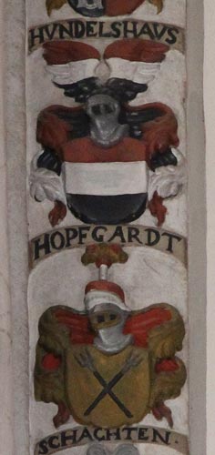 Das dritte Wappen auf der Spindelseite ist das der von Hundelshausen ("HVNDELSHAVS"), von Rot, Silber und Schwarz geteilt, auf dem Helm mit hier rot-schwarz-silbernen, eigentlich nur schwarz-silbernen Decken ein von Rot, Silber und Schwarz geteilter Flug (Siebmacher Band: He Seite: 14 Tafel: 15, Band: PrE Seite: 104 Tafel: 88, Band: PrE Seite: 201 Tafel: 175, Band: ThüA Seite: 60 Tafel: 46, Jahrbuch des Deutschen Adels, Bd. 3, 1898). Darunter folgt das Wappen der von Hopfgarten ("HOPFGARDT"), hier in Gold (Literatur: Silber) zwei schräggekreuzte, silberne (Literatur: goldene) Streitgabeln mit schwarzem Stiel, auf dem Helm mit hier rot-goldenen (Literatur: schwarz-goldenen) Decken auf einem roten, silbern gestulpten Turnierhut ein gestielter Straußenfederwedel (Literatur: ein hoher goldener Hut mit schwarzem Aufschlag , oben mit schwarzen Hahnenfedern besteckt, vgl. Siebmacher Band: Sa Seite: 2 Tafel: 2, Band: Sa Seite: 33 Tafel: 36, Band: SchwA Seite: 16 Tafel: 10, Band: Schw Seite: 58 Tafel: 3, Band: Erg Seite: 31 Tafel: 14, Band: Ha Seite: 11 Tafel: 10, Band: Lip Seite: 3 Tafel: 3, Band: Me Seite: 11 Tafel: 8, Band: Pr Seite: 177 Tafel: 225, Band: Pr Seite: 13 Tafel: 14, Band: PrGfN Seite: 33 Tafel: 25). Es folgt das bereits beschriebene Wappen der von Schachten ("SCHACHTEN"), dann das der von Helmstadt ("HELMSTET"), in Silber ein flugbereiter (auffliegender) schwarzer Rabe, auf dem Helm mit schwarz-silbernen Decken ein silbernes und ein schwarzes Büffelhorn.