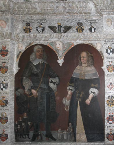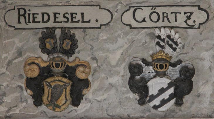 Die Ahnenprobe des Ehemannes beginnt mit dem gewendeten Wappen der von Schlitz genannt Görtz, in Silber zwei schwarze, schrägrechte, oben dreimal gezinnte Balken (Zinnenschrägbalken), auf dem gekrönten Helm mit schwarz-silbernen Decken ein silberner, sparrenweise mit zwei schwarzen, schrägen, oben gezinnten Balken (Zinnenschrägbalken) belegter Flug (Siebmacher Band: Han Seite: 15 Tafel: 16, Band: He Seite: 10 Tafel: 10, Aschaffenburger Wappenbuch Tafel 16 Seite 226). Es steht für Johann Volpert von Schlitz genannt von Görtz (10.2.1602-3.6.1677), seinen Vater Wilhelm Balthasar von Schlitz gen. von Görtz (6.1.1568-17.1.1636), seinen Großvater Eustachius von Schlitz gen. von Görtz (1527-1598) und seinen Urgroßvater Friedrich IV. von Schlitz gen. von Görtz (-1560). Heraldisch rechts daneben steht das Wappen der Riedesel von Eisenbach (unten besser zu sehen, es taucht insgesamt dreimal an diesem Epitaph auf). Es steht für die Mutter Margarethe Riedesel von Eisenbach (23.5.1571-25.11.1613), den Großvater Volprecht Riedesel von Eisenbach (1548-1.3.1610) und den Urgroßvater Hermann Riedesel von Eisenbach (1512-1560).