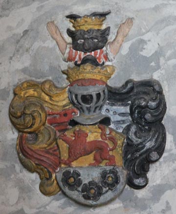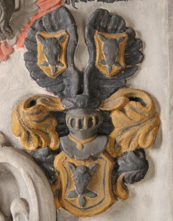 Als nächstes folgt das Wappen der von Boineburg (unten besser zu sehen, denn es taucht zweimal an diesem Epitaph auf) für die Urgroßmutter Katharina von Boineburg (-7.11.1555), Ehefrau von Friedrich IV. von Schlitz gen. von Görtz (-1560). Danach kommt das Wappen der von der Malsburg, es ist geteilt, oben in Gold ein schreitender, roter Löwe, unten eigentlich in Blau drei (2:1) silberne Rosen (hier in Silber drei schwarze Rosen), auf dem Helm mit rechts rot-goldenen und links eigentlich blau-silbernen, hier schwarz-silbernen Decken zwei ausgestreckte, rot gekleidete Arme, dazwischen ein goldengekrönter, rotbewehrter schwarzer Ochsenkopf (Siebmacher Band: Pr Seite: 54 Tafel: 69, Band: PrE Seite: 131 Tafel: 111, Band: PrE Seite: 212 Tafel: 184, Band: SaA Seite: 103 Tafel: 67, Band: He Seite: 19 Tafel: 20, Jahrbuch des Deutschen Adels, Bd. 2, 1898). Das Wappen steht hier für die Urgroßmutter Margarethe von der Malsburg (1523-19.12.1565).