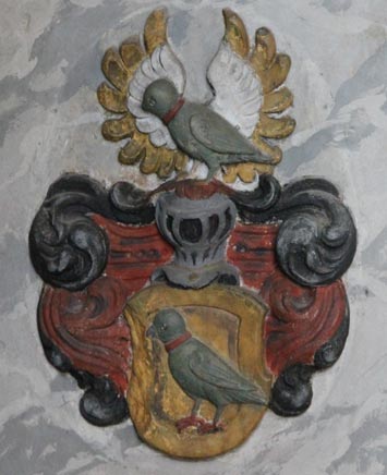 Das breite Gebälk über dem Zentralfeld und die beiden seitlichen Wandvorlagen tragen zusammen die Ahnenprobe beider Ehepartner, vier in der Horizontalen und zweimal vier in der Vertikalen, was eine 8er-Ahnenprobe für jeden Partner ergibt. Die Ahnenprobe beginnt jeweils in der Mitte, läuft mit abnehmender Wichtigkeit und nachrangiger Position in der Ahnentafel zunächst horizontal nach außen und dann den Rand entlang nach unten. Entsprechend finden wir in der Horizontalen jeweils elterliche Wappen und auf der Seite in der Vertikalen oben die beiden in der Großelterngeneration hinzukommenden Wappen und unten die vier in der Urgroßelterngeneration hinzukommenden Wappen. Mehrere Familien kommen aufgrund der engen Versippung regional benachbarter Familien mehrfach vor.