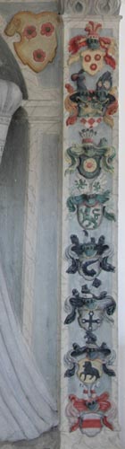 Abb. links: Mit diesem Wappen eröffnen wir die Spindelseite mit den acht Ahnenwappen der Ehefrau, Anna von Trümbach. Das erste und oberste Wappen der heraldisch links angebrachten, vertikalen Reihe ist das der in Wehrda bei Bad Hersfeld beheimateten und zum Ritterkanton Rhön-Werra der fränkischen Reichsritterschaft gehörenden von Trümbach, in Gold drei (2:1) rote, golden bebutzte Rosen, auf dem Helm mit rot-goldenen Decken ein roter, golden aufgeschlagener Hut, dessen Stulp mit drei roten Rosen balkenweise belegt ist, auf dem Hut ein Busch abwechselnd roter und goldener Straußenfedern (Siebmacher Band: He Seite: 28 Tafel: 32, Band: PrE Seite: 174 Tafel: 150, Rietstap). Abb. rechts: Dieses Wappen gehört zu den Schenk von Schweinsberg und ist geteilt, oben in Blau ein schreitender, goldener, rotgezungter Löwe, unten in Silber vier (3:1) rote Rauten, zwei Helme, Helm 1 (rechts): Kopf und Hals eines schwarzen Wolfes, die Ohren mit zwei Federn besteckt, hier rot und schwarz (Schenk von Schweinsberg), Helm 2 (links): ein beiderseits mit einer wie der Schild bez. Scheibe belegter schwarzer Flug (nach dem Aussterben der Vögte von Fronhausen beigefügt). Die Tingierung der Helmdecken entspricht nicht den Vorgaben der Literatur (rot-silbern und blau-golden, vgl. Siebmacher Band: He Seite: 24 Tafel: 27, Band: MeA Seite: 91 Tafel: 51, Band: Bay Seite: 56 Tafel: 58, Band: Na Seite: 9 Tafel: 10, Band: Pr Seite: 62 Tafel: 81, Band: Pr Seite: 351 Tafel: 404, Aschaffenburger Wappenbuch Tafel 42 Seite 123).