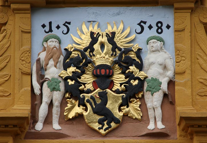Über dem auf der Nordseite gelegenen Hauptportal des Neuen Schlosses befindet sich ein auf 1558 datierter Wappenstein mit dem Wappen Heinrichs von Bibra, in Gold ein aufspringender, schwarzer Biber mit geschupptem Schwanz, auf dem gekrönten Helm mit schwarz-goldenen Decken ein goldener Flug, beiderseits einwärts belegt mit einem schwarzen Biber mit geschupptem Schwanz. Als Schildhalter dienen hier rechts ein wilder Mann, links eine wilde Frau.