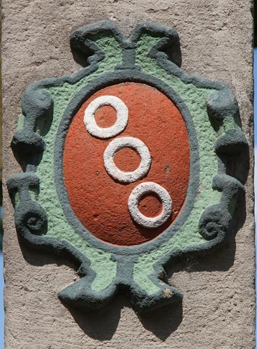 Ein drittes Allianzwappen (Abb. unten) für das gleiche Bauherrenpaar ist etwas versteckter angebracht; es ist auf der Rückseite des südlichen Flügels zu finden am Treppenturm, wo es sekundär vermauert wurde. Seine Entfernung vom ursprünglichen Ort und die Anbringung am Treppenturm stehen in Zusammenhang mit den Umbauarbeiten 1910. Mit der Datierung auf das Jahr 1610 auf den beiden äußersten Abschnitten des Schriftbandes ist es der älteste der Wappensteine dieses Ehepaares.