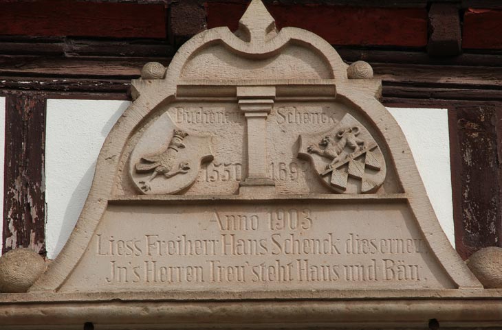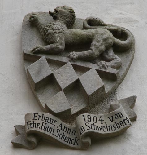 Die Inschrift im unteren Teil des über der Tür angebrachten steinernen Bogenfeldes lautet: "Anno 1903 / Liess Freiherr Hans Schenck dies erneu.(ern) / In's Herren Treu' steht Haus und Bäu." Mit diesem Wortlaut greift der Bauherr den Inschriftentext der Spolie am Schenckenschloß auf, der lautet: "M.D.LXXX DREI (1583) LI(ES)S / BERNHARD WILHELM DI(E)S / ERNEV INS HERREN TREV / STEHT HAVS VND BEV." Die Parallelität der Wortwahl ist beabsichtigt und soll die Kontinuität zwischen ältestem und neuestem Wappenstein versinnbildlichen. Im oberen Teil sind zwei Wappen angebracht, die für die beiden die Geschichte der Oberen Burg bestimmenden Familien stehen.