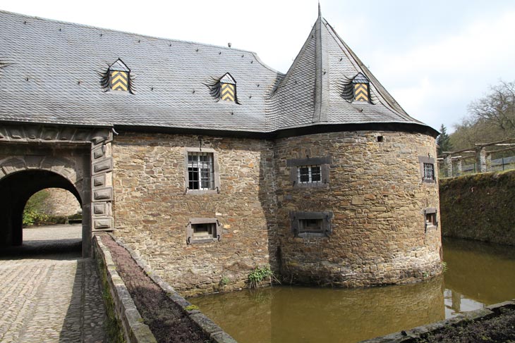 Hier am Torturm begrüßt ein erster, auf 1684 datierter Wappenstein den Besucher, oben über dem rundbogigen Tor mit dem Zugbrückenfalz. Die von einer Krone überhöhte Kartusche zeigt das Wappen der Grafen von Hatzfeld-Gleichen und ist gespalten und zweimal geteilt, Feld 1: in Silber ein schwarzer Doppeladler, golden bewehrt und rot gezungt (Gnadenzeichen), Feld 2: in Blau ein silberner Löwe, golden gekrönt (Grafschaft Gleichen), Feld 3: in Gold ein schwarzer Maueranker (Hatzfeld), Feld 4: in Silber eine rote Rose mit goldenem Butzen (Herrschaft Crottorf), Feld 5: in Silber 3 (2:1) rote Mispelblüten mit goldenem Butzen und grünen Kelchblättern (Herrschaft Wildenburg), Feld 6: silbern-rot geteilt und 4x gespalten (hier nur 4x, normalerweise 5x gespalten) mit wechselnden Tinkturen (Herrschaft Rosenberg).