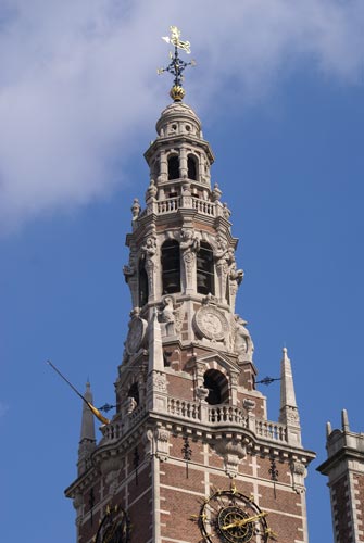 Abb. links: Seitengiebel und Treppenturm zum Herbert Hooverplein hin. Abb. rechts: Turmbekrönung.