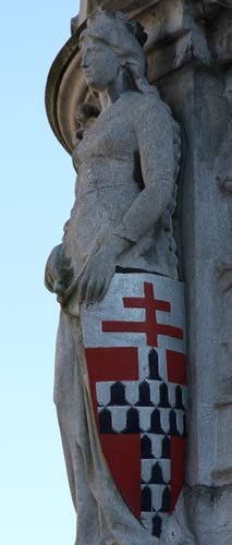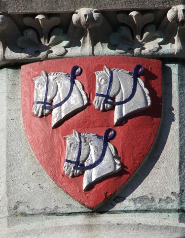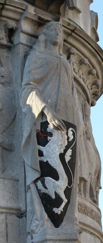 An der Fassade sind rechts in den Brüstungen der Spitzbogenfenster des Obergeschosses zwei Schildhalterpaare zu sehen mit den Wappenschilden für die vier Städte Brügge (Abb. unten links), Ostende (Abb. unten rechts), Kortrijk (Abb. oben links) und Ypern (Abb. oben rechts). Die Wappen von dreien der vier Städte wurden bereits im Abschnitt zum Denkmal für Jan Breydel und Pieter de Coninck beschrieben. Das Stadtwappen von Ostende (Oostende) zeigt in Gold einen schwarzen Sparren, begleitet von drei aufrechten schwarzen Schlüsseln, der Bart der beiden oberen Schlüssel einwärts, der des unteren Schlüssels nach links gekehrt (in goud een keper van sabel, vergezeld van drie sleutels van dezelfde kleur, die van het schildhoofd naar elkaar toegewend, die van de schildvoet omgewend).