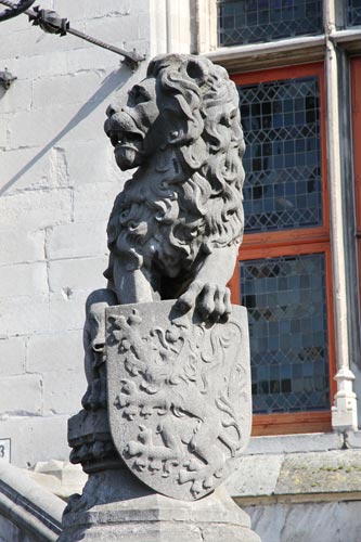 Löwen sind in Brügge ubiquitär: Abb. links: Kleine Pforte neben dem großen Erdgeschoßportal des Provinzialpalastes. Abb. rechts: An der monumentalen Eingangstreppe zum Provinzialpalast stehen zwei weitere Löwen mit Löwenschild (nur der rechte ist abgebildet).