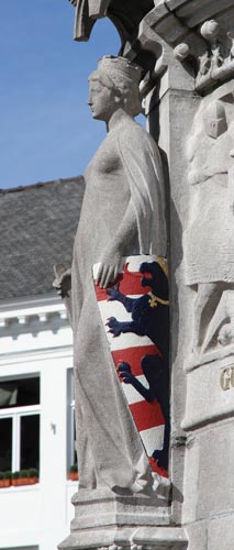 Weitere Wappen sehen wir am Großen Markt an der Ostseite: Dort dominieren die beiden großen neugotischen Gebäude des Provinzialpalastes (Provinciaal Hof, früher Landgericht) und der Post (Postgebouw). Der Provinzialpalast wurde 1887-1892 in weißem Naturstein errichtet. Eine zweite Bauphase schloß sich 1914-1921 an. Der Stil orientiert sich an den gotischen Fassaden des Rathauses und des Gruuthuse-Palastes. Das Gebäude wird heute für offizielle und repräsentative Veranstaltungen genutzt, für Ausstellungen, Sitzungen und Empfänge.