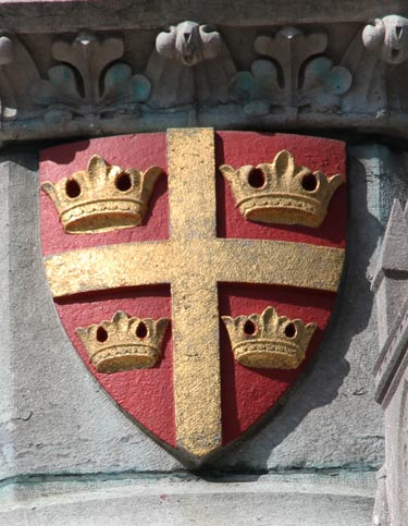 Abb. links: Unter der linken Bronzefigur befindet sich ein Wappenschild für Jan Breydel, in Rot drei (2:1) silberne Pferdeköpfe mit blauem Zaumzeug (in keel drie paardenkoppen van zilver, gebreideld van azuur, geplaatst 2 en 1). Dieses Wappen ist im Rietstap aufgeführt, mit goldenen Mähnen: "De gueules à trois têtes et cols de cheval d'argent bridées d'azur et crinées d'or. Cimier une tête de cheval de l'écu. Abb. rechts: Unter der rechten Bronzefigur befindet sich ein Wappenschild für Pieter de Coninck, in Rot ein goldenes Kreuz, bewinkelt von vier goldenen Kronen (in keel een kruis van goud, tussen de armen 4 gouden kronen), ein redendes Wappen (ohne Literaturbeleg).