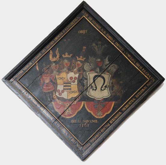 Drei weitere Totentafeln in quadratischer, übereck aufgehängter Form sind an der nördlichen Seitenwand am Ende des südlichen Seitenschiffs zu sehen, über dem verbindenden Bogen zum Chorraum, 1: 2 aufgehängt. Die optisch rechte Tafel trägt im Zentralfeld die Daten "OBYT (= OBIIT) DIE 11. NOVEMB(RIS) 1767" und als Umschrift die Worte "WEYL(AND) DIE HOCHGEB(ORENE) FR(AU) ISABELLA THERESIA CAROLINA DES H(EILIGEN) R(ÖMISCHEN) R(EICHES) GRAEFIN VON HATZFELDT WILDENBURG WEISWEILER PALAND GEBOHR(E)NE FREYIN VON LOE ZU WISSEN FR(AU) ZU WACHENDORF OVERBACH WINCKELHAUSEN CALCUM MERLOE etc. DAME DES HOCHEN ORDENS St. ELISABETHA".