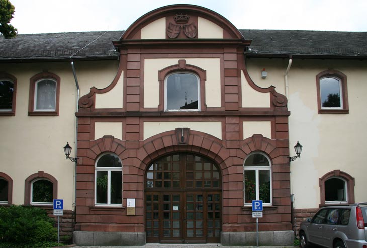 Eine ganz andere "Besetzung" finden wir bei den aus dem 19. und frühen 20. Jh. stammenden Wappensteinen. Am Eingang zum von der Altstadt aus gesehen rechten (nördlichen) Teil des Schlosses befindet sich rechterhand des großen Torbogens das Wappen der von Berckheim, in Gold ein durchgehendes rotes Kreuz, auf dem Helm mit rot-goldenen Decken auf einem roten Kissen mit goldenen Quasten eine goldene Ente (Siebmacher Band: Bad Seite: 4 Tafel: 4, Band: Els Seite: 3 Tafel: 4, Alter Siebmacher von 1605). Das Wappenbild dieser elsässischen Familie ist identisch mit dem der Herren von Andlau, aber die Helmzier ist eine andere. Vermutlich sind die von Berckheim, die ihren Stammsitz in Mittel-Berckheim (das wunderschön malerische Mittelbergheim, Département Bas-Rhin, Arrondissement Sélestat-Erstein) hatten, ein Zweig der von Andlau, der sich in der ersten Hälfte des 13. Jh. abgespalten hatte.