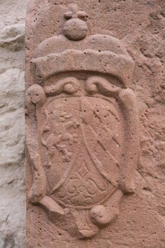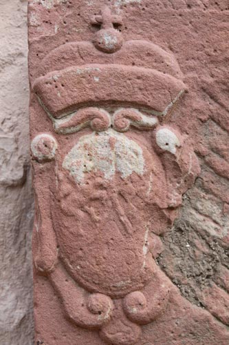 Der dritte Wappenstein ist komplexer und gehört zu Johann Philipp von Schönborn (6.8.1605-12.2.1673), der in drei Hochstiften Fürstbischof war, in Würzburg ab 1642, in Mainz ab 1647 und in Worms ab 1663. Alle drei sind hier zu sehen, denn der Hauptschild ist geteilt und zweimal gespalten, Feld 1: "Fränkischer Rechen" = von Rot und Silber mit drei aufsteigenden Spitzen geteilt, Herzogtum zu Franken, Feld 2 und 5: in Rot ein silbernes sechsspeichiges Rad (Erzstift Mainz), Feld 3 und 6: in Schwarz ein schräg aufwärts gerichteter und schräggestellter silberner Schlüssel, begleitet von 4:4 goldenen Schindeln, Hochstift Worms, Feld 6: "Rennfähnlein" = in Blau eine rot-silbern gevierte und an den beiden senkrechten Seiten je zweimal eingekerbte, schräggestellte Standarte mit goldenem Schaft, Hochstift Würzburg, Herzschild: in Rot auf drei silbernen Spitzen ein schreitender goldener Löwe mit blauer Krone, Stammwappen der von Schönborn. Über der Kartusche ist ein Kurhut zu sehen, darunter ein verwitterter geflügelter Kopf. Das gestürzte Schwert (abgewittert) sowie der Krummstab (sehr vereinfacht) sind hinter dem Schild schräggekreuzt. In dieser Form wurde das Wappen 1663-1673 geführt. Auf diesem Stein, der nicht originär zu Groß-Umstadt gehört, ist der Fürstbischof in seiner Funktion als Bischof von Mainz vertreten - der natürlich in der Stadt nichts zu sagen hatte, weil er kein Landesherr war. Der ehemalige Grenzstein stammt vielmehr aus kurmainzischem Gebiet, das Bachgau und die Vogtei Obernburg waren mainzisch und grenzten an das Kondominat Umstadt.