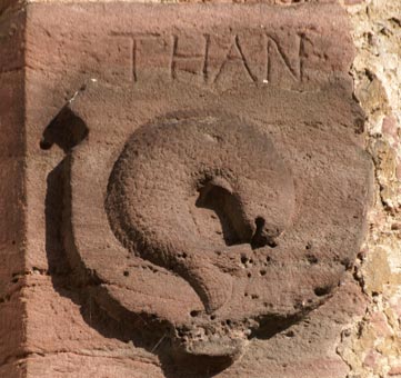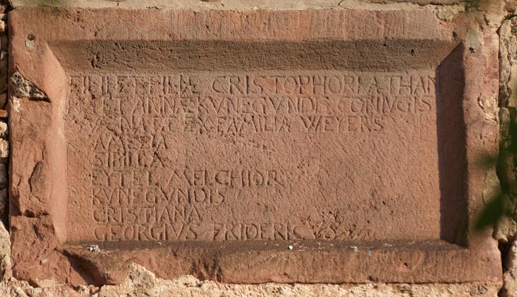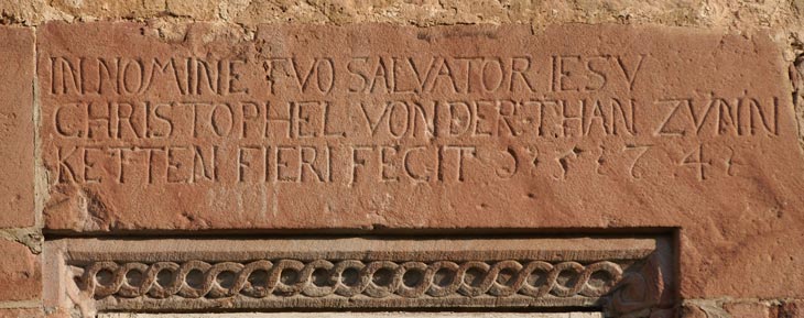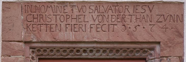 Die eigentliche Bauinschrift des Sohnes ist über dem Fenster auf dem Gewände zu lesen: "IN NOMINE TVO SALVATOR IESV / CHRISTOPHEL VON DER THAN ZVNN KETTEN FIERI FECIT 1574" - im Deinem Namen, Erlöser Jesus, hat Christoph von der Tann zu Ketten 1574 den Bau veranlaßt. Der genannte Besitz in Ketten ist heute ein Ortsteil von Geisa im Wartburgkreis. Der Ort war vom 16. bis zum 18. Jh. in Besitz der Herren von der Tann. Das von den Herren von Ketten erbaute Schloß wurde 1790 abgebrochen.