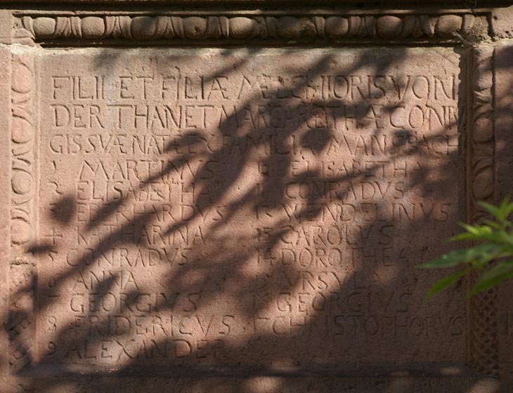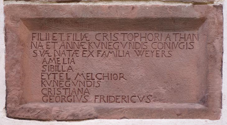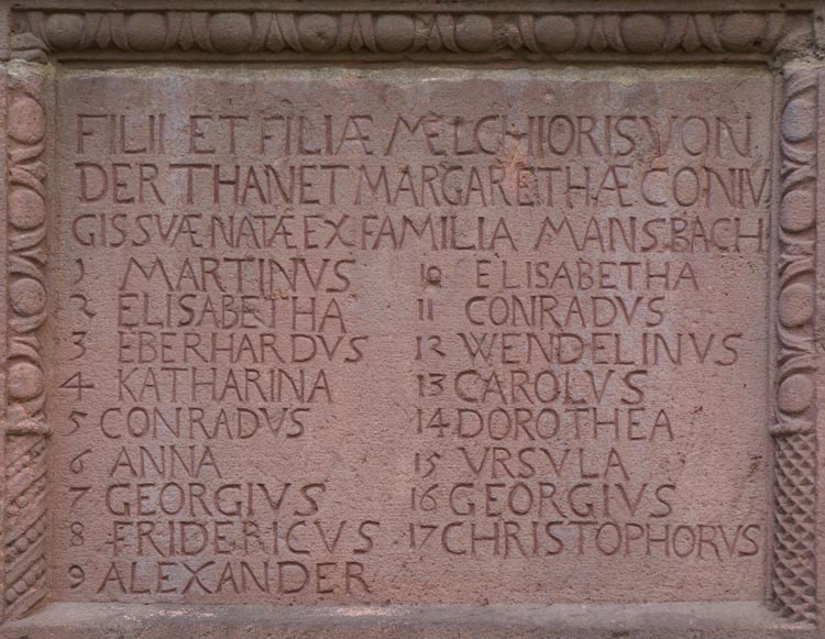 Einen ersten Einblick in die Familien-Genealogie gibt eine in das Mauerwerk unter dem Fenster im Hocherdgeschoß eingelassene Steintafel mit der Nennung des Bauherrn als letztes von insgesamt 17 Kindern seiner Eltern: "FILII ET FILIAE MELCHIORIS VON / DER THAN ET MARGARETHAE CONIV/GIS SVAE NATAE EX FAMILIA MANSBACH / 1. MARTINVS / 2. ELISABETHA / 3. EBERHARDVS / 4. KATHARINA / 5. CONRADVS / 6. ANNA / 7. GEORGIVS / 8. FRIDERICVS / 9. ALEXANDER / 10. ELISABETHA / 11. CONRADVS / 12. WENDELINVS / 13. CAROLVS / 14. DOROTHEA / 15. VRSVLA / 16. GEORGIVS / 17. CHRISTOPHORVS. Ein Eierstab rahmt seitlich und oben das Inschriftenfeld, im unteren Teil abgelöst von unterschiedlichen Musterornamenten. Schräg geschnittene Perlstäbe und Rautenmuster bilden eine Art Sockelzone. Oben zum Fenster hin ist ein Gesims mit Liliendekor zu sehen. Der an dritter Stelle genannte Eberhard von der Tann wurde Gesandter der Herzöge von Sachsen und ein eifriger Kämpfer für die Reformation. In eben diesem Jahr 1574, als der Turm aufgestockt wurde, starb er in seiner Heimatstadt Tann. Die hohe Kindersterblichkeit zeigt sich darin, daß drei Namen doppelt vergeben wurden.