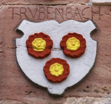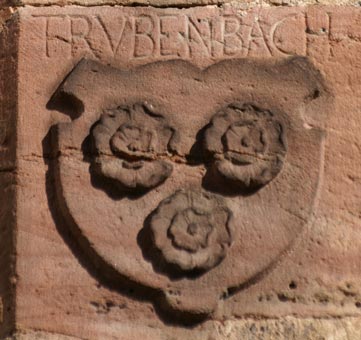 Darunter befindet sich das Wappen der von Trümbach zu Wehrda ("TRVBENBACH"), in Gold drei (2:1) rote Rosen. Die hier nicht dargestellte Helmzier wäre zu rot-goldenen Decken ein hoher roter Hut, auf dem goldenen Aufschlag mit den drei Rosen belegt, an der Spitze mit rot-goldenen Federn besteckt (Siebmacher Band: He Seite: 28 Tafel: 32, Band: PrE Seite: 174 Tafel: 150). Die neue Farbfassung entspricht nicht den Erwartungen, weil die Feldfarbe golden statt silbern sein muß, wie Vergleichsdarstellungen auf zahlreichen farbig gefaßten Epitaphien belegen. Ferner wurde hier das Gold des Butzens auf die gesamte innere Blütenblattlage der Rosen ausgedehnt, was ebenso nicht korrekt ist, denn die innere Blattlage müßte ebenfalls rot sein, wenn die Rose als rot definiert ist - nur die Staubgefäße dürfen golden abgesetzt sein, also der innerste kreisförmige Bereich.