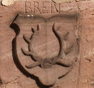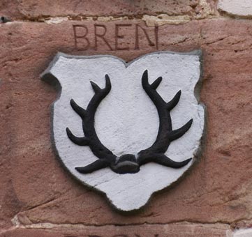 Die 1525 erloschene Familie von Brenden ("BREN") führt in Silber ein schwarzes Hirschgeweih mit Grind. Die nicht dargestellte Helmzier wäre zu schwarz-silbernen Decken ein schwarzes Hirschgeweih (Aschaffenburger Wappenbuch Tafel 45 Seite 35, 137, 149, 217, 214, Schöler, Familienwappen S. 34, T. 100). Dem entspricht die neue Farbfassung. Es besteht übrigens eine Wappengleichheit mit den Brunner von Babenhausen und den von Stockar. Das selten anzutreffende Wappen ist im Würzburger Domkreuzgang und in der Sepultur der Würzburger Domherren wiederzufinden.