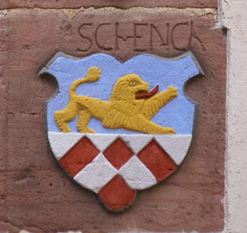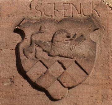Das achte und letzte Wappen der Ahnenprobe ist das gewendete der von Schenk zu Schweinsberg ("SCHENCK"); es ist geteilt, oben in Blau ein schreitender goldener Löwe, unten in Silber 4 (3:1) rote Rauten, die sich gegenseitig und den Schildrand berühren. Zu dem Schild gehören zwei hier nicht dargestellte Helme, Helm 1 (rechts): auf dem Helm mit rot-silbernen Decken ein wachsender silberner Wolfsrumpf, in dessen Ohren zwei Federn stecken, silbern und rot (Stammkleinod), Helm 2 (links): auf dem gekrönten Helm mit blau-goldenen Decken ein beiderseits mit einem wie der Schild bez. Schildchen belegter, schwarzer Flug (Siebmacher Band: He Seite: 24 Tafel: 27, Band: MeA Seite: 91 Tafel: 51, Band: Bay Seite: 56 Tafel: 58, Band: Na Seite: 9 Tafel: 10, Band: Pr Seite: 62 Tafel: 81, Band: Pr Seite: 351 Tafel: 404, Aschaffenburger Wappenbuch Tafel 42 Seite 123, Schöler, Familienwappen S. 95, Rahrbach S. 213-215). Dem entspricht die neue Farbfassung.