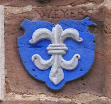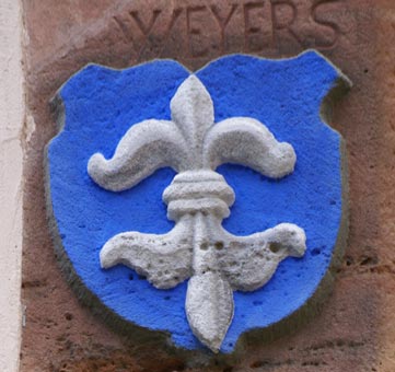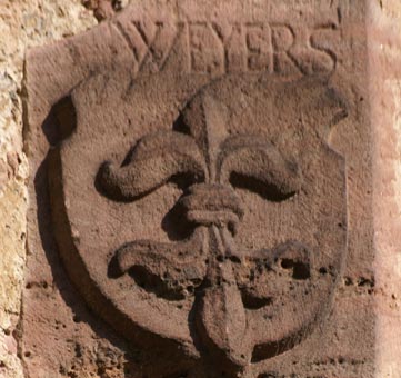Das zweimal auftretende Wappen der von Ebersberg gen. Weyers ("WEYERS") zeigt in Blau eine silberne Lilie. Die hier nicht dargestellte Helmzier wäre zu blau-silbernen Decken eine silberne Lilie zwischen einem blauen Flug (Siebmacher Band: BayA3 Seite: 138 Tafel: 94, Rahrbach S. 48-50, Zobel Tafel 367, Schöler, Familienwappen S. 40, T. 44). Dem entspricht die neue Farbfassung.