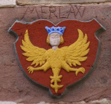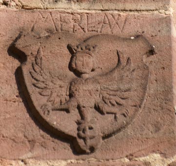 Die aus der Gegend von Grünberg stammenden und 1748 erloschenen von Mörlau (Merlau) gen. Böhm ("MERLAW") führen in Rot einen goldenen, gekrönten Jungfrauenadler (Rietstap, Siebmacher Band: ThüA Seite: 65 Tafel: 50, Hessisches Wappenbuch S. 99). Das Wappen zeigt ein Fabelwesen, eine sog. Harpyie. Sämtliche Extremitäten sind die eines Adlers, Beine, Schwanz, ausgebreitete Flügel. Der Rumpf ist eindeutig als weiblich zu erkennen, und das menschliche Haupt ist gekrönt. Die hier nicht dargestellte Helmzier wäre zu rot-goldenen Decken ein wachsender goldener, gekrönter Löwe zwischen einem roten Flug. Dem entspricht die neue Farbfassung. Es besteht übrigens eine Wappengleichheit mit den von Felda.