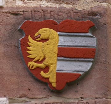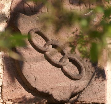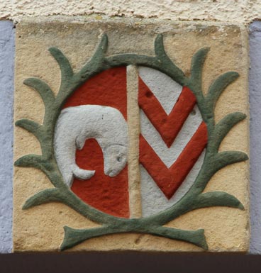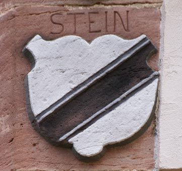 Die von Stein zu Ostheim ("STEIN") haben als Wappen in silbernem Schild einen schwarzen Schrägbalken, hier gewendet. Die hier nicht dargestellte Helmzier wäre zu schwarz-silbernen Decken ein beiderseits wie der Schild bez. offener Flug, Schrägbalken sparrenweise gegeneinander geneigt (Rahrbach S. 248-250, Schöler, Familienwappen: S. 101., T. 15, Siebmacher II. 8., 5.). Dem entspricht die neue Farbfassung weitgehend, auch wenn die beiderseitige Bordierung eine Fehlinterpretation ist - wenn man ein Wappen ist Stein haut, haben die Linien eben eine gewisse materialbedingte Eigenstärke, die hier falsch als Doppelgrenze interpretiert wurde.