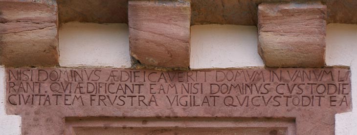 Noch eine Inschrift ist ganz oben unterhalb der Kragsteine zu lesen: "NISI DOMINVS AEDIFICAVERIT DOMVM IN VANVM LA(BORAVE) / RANT QVI AEDIFICANT EAM NISI DOMINVS CVSTODIE / CIVITATEM FRVSTRA VIGILAT QVI CVSTODIT EA(M)." - das ist Psalm 126, Canticum graduum Salomonis, Vers 1: Nisi Dominus aedificaverit domum in vanum laboraverunt qui aedificant eam nisi Dominus custodierit civitatem frustra vigilat qui custodit eam - ein Lied Salomos im Höheren Chor: Wenn nicht der Herr das Haus baut, so arbeiten umsonst, die daran bauen. Wo nicht der Herr die Stadt behütet, so bewacht sie der Wächter umsonst. Erst bei den Baumaßnahmen 2016-2017 wurde auf der Ostseite des Turmes eine weitere Inschriftentafel mit einem lateinischen Zitat des Erasmus von Rotterdam entdeckt, übersetzt "Alles in dieser Welt wird durch lange Geduld, Arbeit und einen scharfen Geist besiegt".