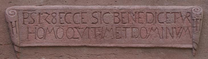Ein kleines Schriftband befindet sich unter dem Inschriftenfeld mit den 17 Kindern und hat folgendem Inhalt: "PS 128 ECCE SIC BENEDICETVR / HOMO QVI TIMET DOMINVM" - Psalm 127/4: Siehe, auf diese Weise wird der Mann gesegnet, der den Herrn fürchtet.