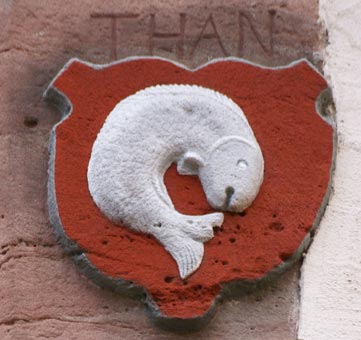 Der gewendete Wappenschild der von der Tann ("THAN") zeigt in Rot eine normalerweise nach rechts gewendete, nach oben gekrümmte, silberne Forelle. Die hier nicht abgebildete Helmzier wäre zu rot-silbernen Decken ein roter Schaft belegt mit einer nach oben gekrümmten, mit Kopf und Schwanz abwärts gebogenen, silbernen Forelle und oben besteckt mit drei Straußenfedern (Siebmacher Band: He Seite: 27 Tafel: 31, Band: Bay Seite: 60 Tafel: 63, Band: Bay Seite: 119 Tafel: 146, Band: Sa Seite: 17 Tafel: 16, Band: Bad Seite: 25 Tafel: 16; Schöler, Familienwappen: S. 104-105, Tafel 57; Rahrbach S. 261-264). Dem entspricht die neue Farbfassung.