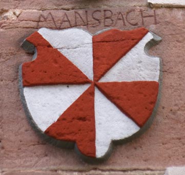 Der Schild der von Mansbach ("MANSBACH) ist von Rot und Silber achtfach geständert. Die hier nicht dargestellte Helmzier wäre zu rot-silbernen Decken ein wachsender Mann mit silbern gestulptem, rotem Hut und achtfach von Rot und Silber geständerter Kleidung (Siebmacher Band: Pr Seite: 253 Tafel: 303, Band: He Seite: 19 Tafel: 20, Band: Reu Seite: 7 Tafel: 5 und Band: Pr Seite: 54 Tafel: 69, Jahrbuch des Deutschen Adels, Bd. 2, 1898). Dem entspricht die neue Farbfassung, auch wenn die Ständerung hier silbern-rot ist, was aber durchaus als gewendeter Inhalt interpretiert werden kann.