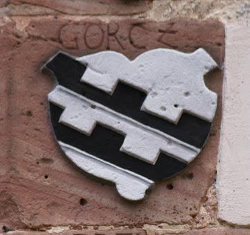 Als nächstes folgt der nicht gewendete Wappenschild der von Schlitz genannt Görtz ("GORCZ"), in Silber zwei schwarze, schrägrechte, oben gezinnte Balken (Zinnenschrägbalken). Die hier nicht dargestellte Helmzier wäre zu schwarz-silbernen Decken ein silberner, sparrenweise mit zwei schwarzen, schrägen, oben gezinnten Balken (Zinnenschrägbalken) belegter Flug (Siebmacher Band: Han Seite: 15 Tafel: 16, Band: He Seite: 10 Tafel: 10, Aschaffenburger Wappenbuch Tafel 16 Seite 226). Dem entspricht die neue Farbfassung.