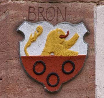 Die von Brunn (Bronne) zu Münnerstadt ("BRON") führen einen geteilten Schild, oben ein aus der Teilung wachsender Löwe, unten drei (2:1) Ringe (Sturm, Altkreis Fulda, 1989, S. 864). Die neue Farbfassung, der Löwe oben wachsend golden in silbernem Feld, die Ringe schwarz in rotem Feld, ist sowohl oben als auch unten heraldisch unplausibel wegen zweifachen Farbregelverstoßes, kann aber mangels Literaturnachweisen nicht verifiziert werden, Hinweise willkommen. Das Motiv als solchen ist in verschiedenen Farben bei mehreren anderen Familien bekannt (z. B. Asseln, Schaller).