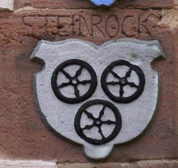 Die 1734 erloschene Familie von Steinau gen. Steinrück ("STEINROCK") führt in Silber drei (2:1) schwarze, fünfspeichige Wagenräder. Die hier nicht dargestellte Helmzier wäre zu schwarz-silbernen Decken ein schwarzes, fünfspeichiges Wagenrad, oben mit silbernen Straußenfedern besteckt (Aschaffenburger Wappenbuch Tafel 82 Seite 124, Siebmacher Band: SchlA1 Seite: 104 Tafel: 76, Band: ThüA Seite: 85 Tafel: 67, Band: Pr Seite: 393 Tafel: 440, Band: Sa Seite: 48 Tafel: 56, Band: BayA3 Seite: 95 Tafel: 61, Rahrbach S. 250-252, Schöler, Familienwappen S. 101-102, T. 129). Dem entspricht die neue Farbfassung.