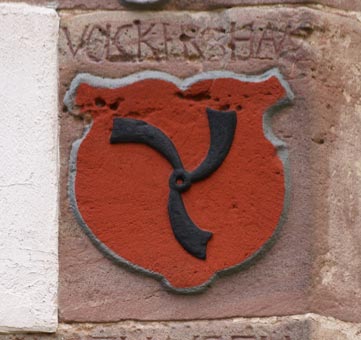 Das Wappen der thüringischen von Völkershausen ("VOLCKERSHAVS", aus Vacha, Wartburgkreis) wird gewöhnlich mit einem goldenen Feld und einer Gruppe von drei deichselförmig im Dreipaß mit den Mundstücken in der Mitte zusammengestellten Hifthörnern ohne Band dargestellt. Frühe Siegel wie z. B. das des Jahres 1366 von Friedrich von Völkershausen geben aber Anlaß zu der Vermutung, daß es sich um eine nachträglich gegenständlich uminterpretierte sechsfache golden-schwarze Schneckenständerung gehandelt haben könnte. Für diese These spricht neben der Siegeldarstellung auch die Tatsache, daß die Hörner in der Spätgotik ohne Band und ohne Beschläge dargestellt werden und somit noch eine gewisse Nähe zum gebogenen Ständer haben. Die hier nicht dargestellte Helmzier wäre zu schwarz-silbernen Decken eine sitzende schwarze Bracke zwischen zwei silbernen Büffelhörnern (Siebmacher Band: BayA1 Seite: 190 Tafel: 192; Band: ThüA Seite: 46 Tafel: 36 abweichend mit silberner Feldfarbe und einem Mohrenkopf anstelle der Bracke). Hier ist beim Anstreichen ein Fehler passiert - die rote Feldfarbe ist falsch und widerspricht zudem heraldischen Grundprinzipien.