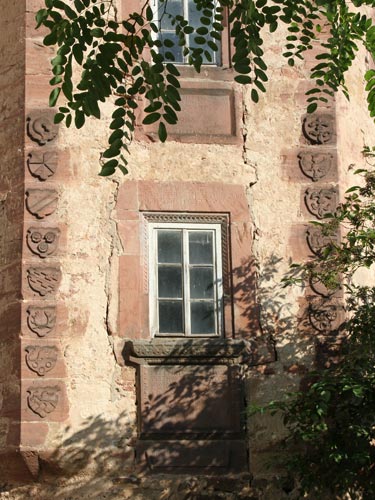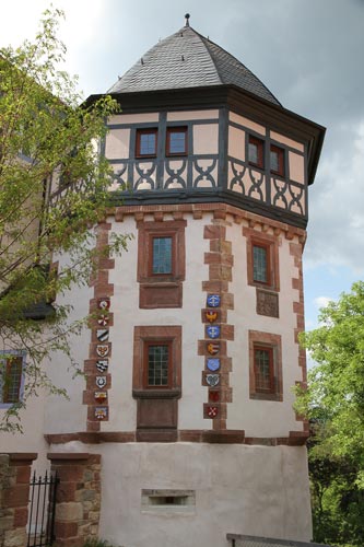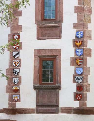 Eine einzigartige Besonderheit ist eine in zwei Spalten angeordnete Ahnenprobe am Turm des Blauen Schlosses. Im Jahr 2017 ist der Turm außen renoviert und neu verputzt und gestrichen worden; dabei wurden auch alle Wappen farbig gefaßt, so daß sie einen ganz besonderen Blickfang rechts des Torweges zum Innenhof darstellen. Im folgenden werden sowohl die Bilder aus der Zeit vor der Renovierung (Photos aus dem Jahr 2013, z. B. die beiden Bilder oben) als auch solche danach aus dem Jahr 2018 (z. B. die beiden Bilder unten) gegenübergestellt, nachdem die bislang unauffälligen Sandsteinreliefs zu einem echten Blickfang geworden sind.