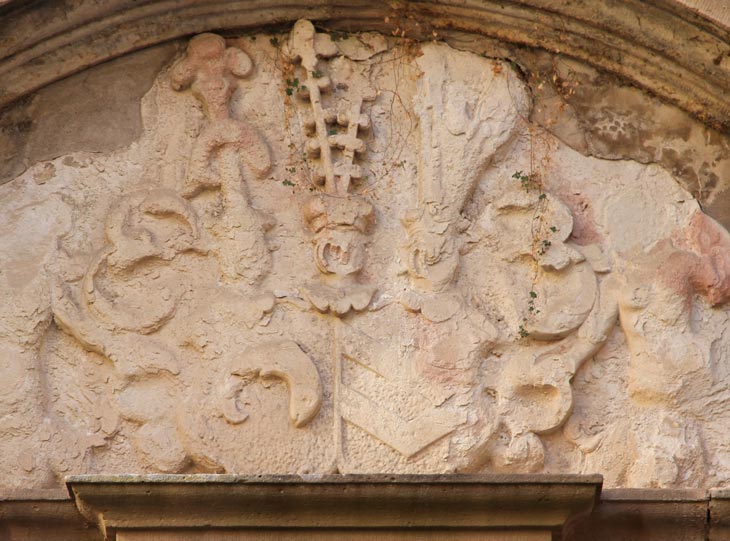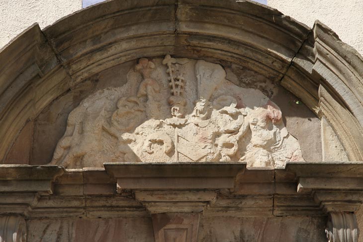 Der nächste Wappenstein des Blauen Schlosses ist über dem Haupteingang im Innenhof innerhalb des Segmentbogengiebelfeldes zu sehen. Der Stein ist stark verwittert, läßt aber noch das Wesentliche erkennen. Die beiden Schildhalter seitlich lassen sich nur noch erahnen. Heraldisch rechts sehen wir das Wappen der von der Tann, in Rot eine rechts gewendete, nach oben gekrümmte, silberne Forelle, auf dem Helm mit rot-silbernen Decken ein roter Schaft belegt mit einer nach oben gekrümmten, mit Kopf und Schwanz abwärts gebogenen, silbernen Forelle und oben besteckt mit drei Straußenfedern. Heraldisch links ist das Wappen der ursprünglich thüringischen von Witzleben zu sehen, in Silber zwei gestürzte rote Sparren. Dazu werden zwei Helme geführt: Helm 1 (rechts, hier in der Mitte): auf dem Helm mit rot-silbernen Decken auf einem gestulpten Hut zwei goldene (alternativ schwarze) Stäbe (Schäfte, Ratteln, das sind Schäfte mit beweglich durchgesteckten Querstäben), beide an der Seite mit je 4x 2 Kleeblättchen, Kugeln oder Schellen besteckt und oben jeweils mit 3 roten und silbernen Straußenfedern besteckt. Helm 2 (links): auf dem Helm mit rot-silbernen Decken wachsend Hals und Kopf eines Geiers mit goldenem, beringtem Halsband zwischen rechts zwei, links drei silbern-rot geteilten Fähnchen. Das ist eine auch alternativ bei einigen Linien vorkommende Helmzier, typisch für die Liebensteiner (jetzt Oldenburger) Linie. Etwas besser sind die Details an dem Wappenstein am Roten Schloß zu erkennen. Der Stein stammt aus der Zeit um 1716, als die beiden viergeschossigen Flügel des Blauen Schlosses völlig umgebaut wurden und ihre heutige Gestalt erhielten. Der Segmentbogengiebel wurde glücklicherweise aus härterem Material angefertigt, so daß sich die fortgeschrittene Verwitterung auf den Wappenstein beschränkt.